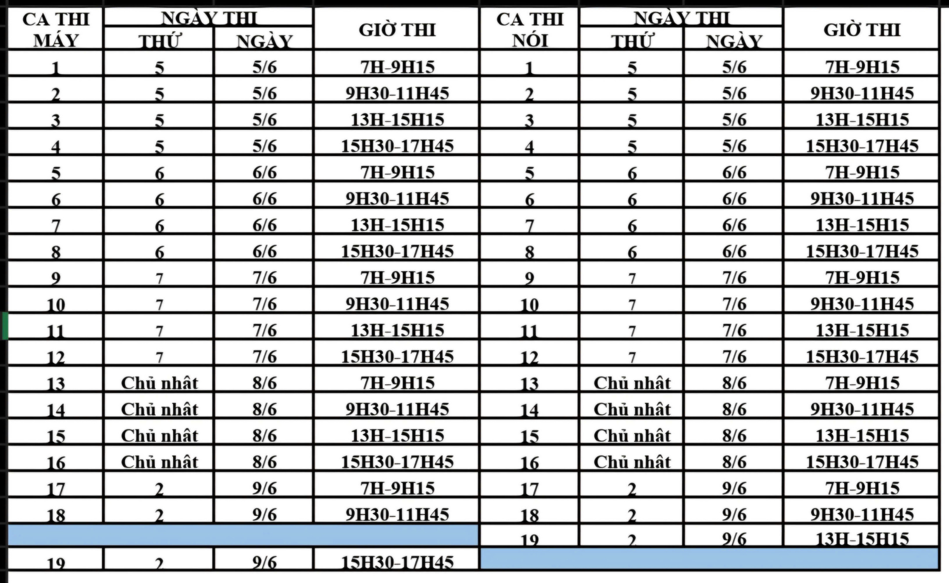 - Riêng chiều ngày 9/9 : ca nói 19 : 13h-15h15, ca máy 19: 15h30-17h45